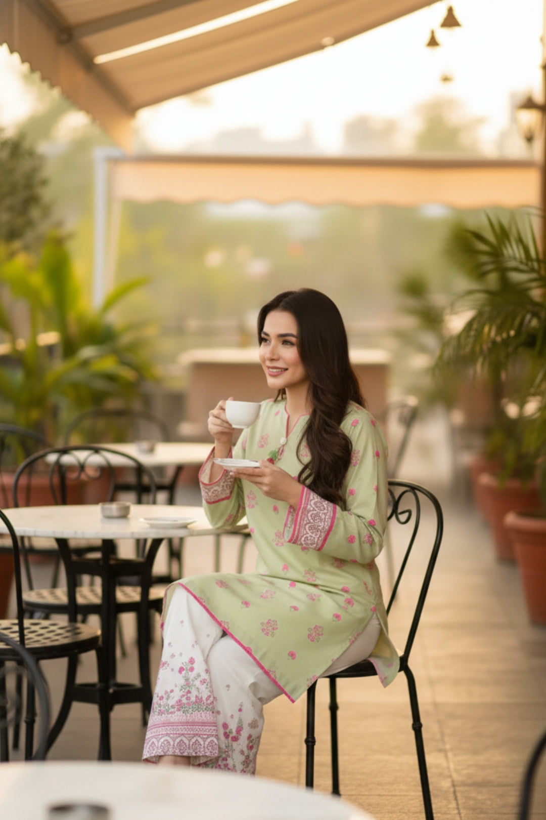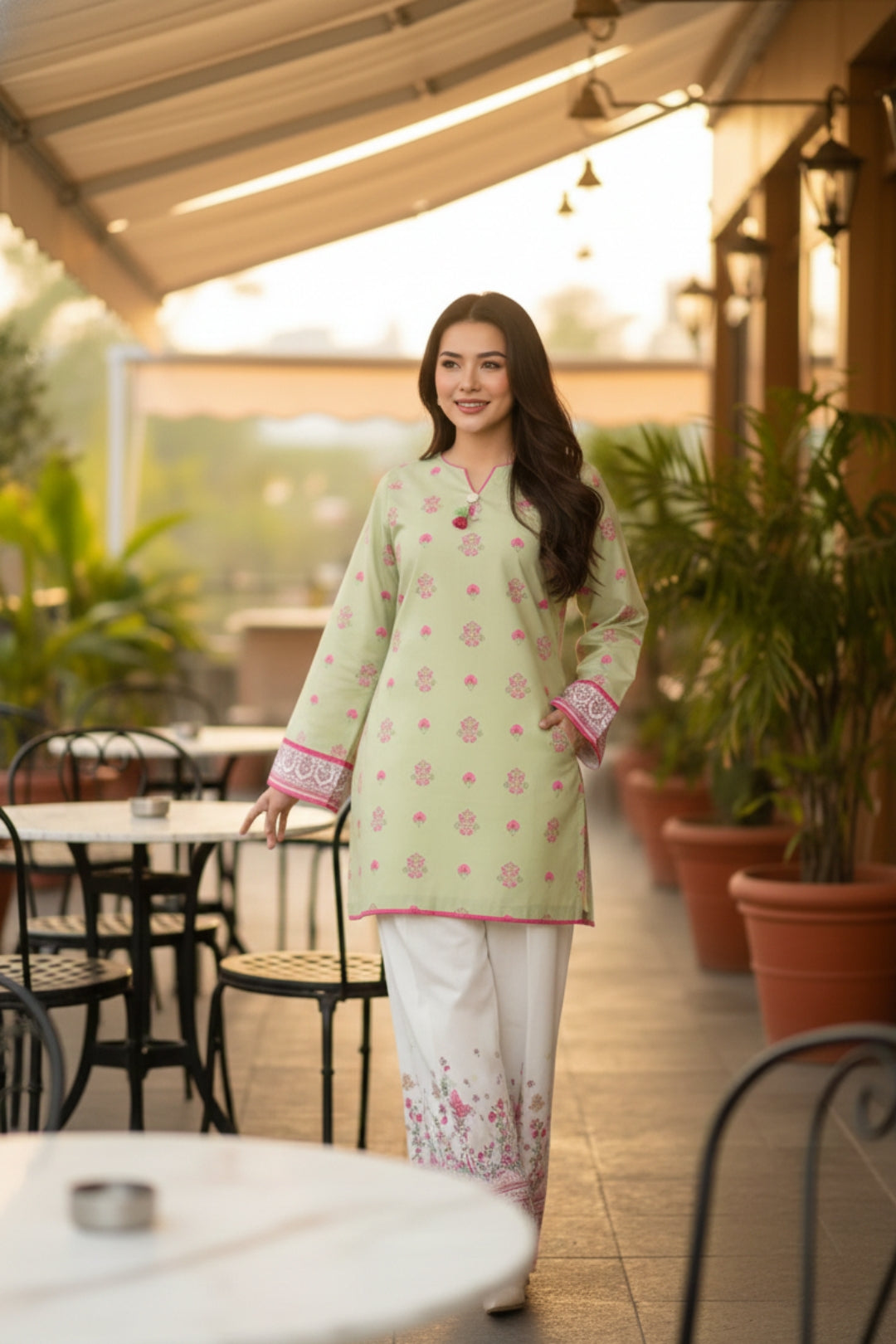 Step into timeless elegance with this sage green kurta, adorned with delicate floral motifs and intricate thread detailing. The contrast pink finishing along the neckline, sleeves, and hem adds a vibrant touch. Paired with a stunning printed Farshi Shalwar, featuring intricate borders and blooming florals, this ensemble is a perfect blend of tradition and grace. Whether you're attending a festive gathering or an intimate Shadi celebration, this outfit ensures effortless sophistication.