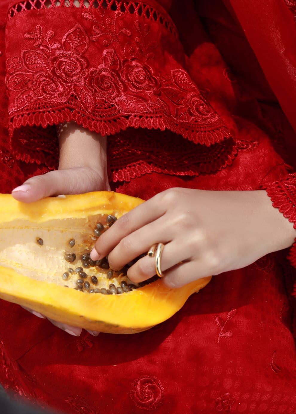 A striking red shirt designed in a three paneled A line silhouette, highlighted with embroidery along the hem, side slits, and a soft all over spray. 3D floral accents elevate the neckline, while wide open sleeves add a breezy charm. Styled with plain red straight trousers featuring intricate cutwork at the hem, and finished with a cutwork and scalloped red premium organza dupatta for a refined yet statement look.